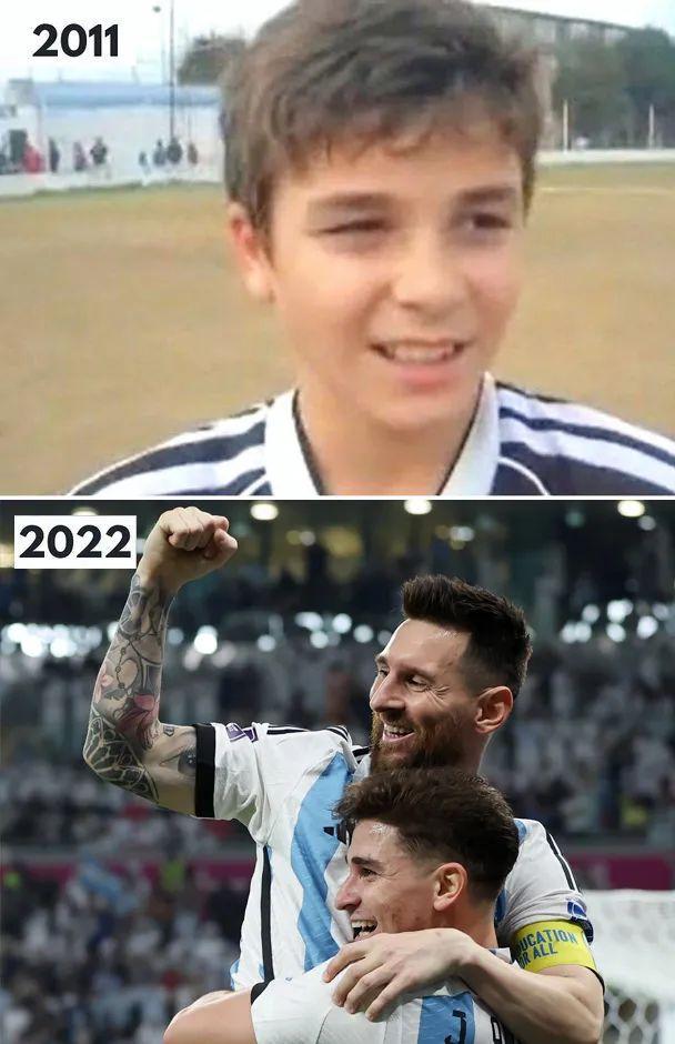 11年前阿爾瓦雷斯接受採訪,說出了對11歲阿根廷少年而言平平無奇的足球夢想——“參加世界盃”。而當記者問及他的偶像,他的回答同樣毫無新意。不過現在,他已經用兩粒進球成爲了本屆世界盃最亮眼的00後球員之一,而在他進球后主動送上擁抱的便是偶像梅西。