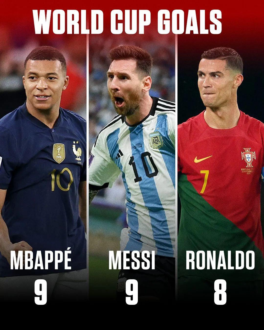 姆巴佩的世界盃進球數追平梅西、巴喬、羅西、維埃裏、瓦瓦、尤西比奧等前輩巨星,也是本屆世界盃金靴獎的大熱門。姆巴佩至少還有1場比賽可繼續進球,追上萊因克爾、巴蒂斯圖塔、穆勒,甚至克林斯曼、柯奇士等名宿。