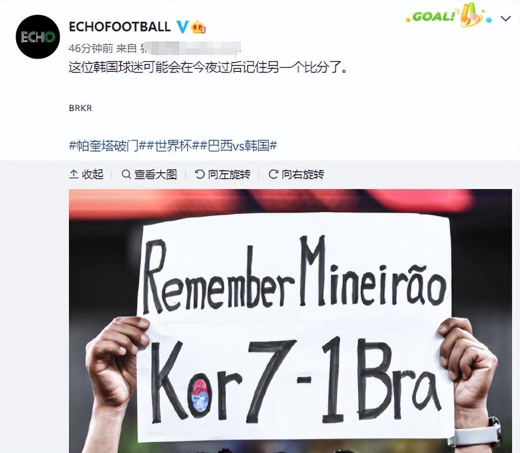 在看臺上,有一位韓國球迷舉牌嘲諷巴西1-德國,結果自己的球隊在上半場就被巴西打花,最後被巴西親手送出局。而在4小時前,日本也有球迷挑釁金球獎先生莫德里奇,結果日本在點球大戰罰丟了三個點球,以總比分2-4出局。原本有三支亞足聯球隊打進世界盃16強的,但澳大利亞、日本和韓國先後出局,所以亞足聯球隊已經全軍覆沒。