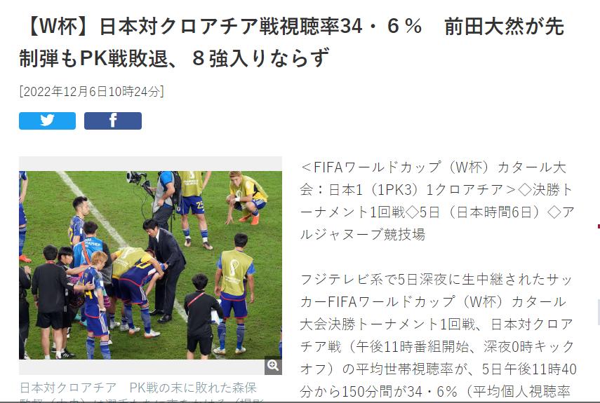 日本媒體《日刊體育》透露,日本對陣克羅地亞這一場比賽,儘管當地時間凌晨0點纔開賽,但在開賽前20分鐘到常規時間90分鐘結束時這一段時間,家庭平均收視率爲34.6%,個人平均收視率爲20.2%;到了加時賽時,儘管收視率有所下降,但家庭平均收視率仍然有30.5%,而個人平均收視率爲17.5%。