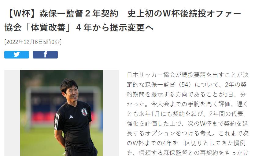 儘管無緣帶隊首次打進世界盃8強,但主帥森保一的執教能力還是得到了日本足協的高度認可,尤其是在小組賽面對德國和西班牙兩支世界盃冠軍球隊,他在下半場的換人調整堪稱神來之筆,是日本隊完成兩場神奇逆轉的最大功臣。唯一被詬病的是,在小組賽第二輪面對哥斯達黎加選擇大輪換玩脫了。