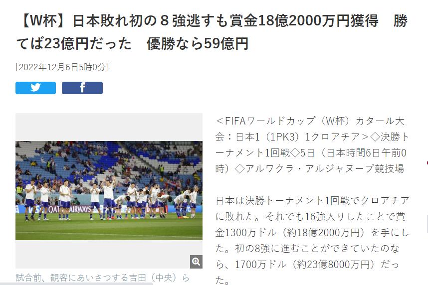 儘管在世界盃1/8決賽出局,但打進16強的日本隊已經獲得18.2億日元獎金,差不多是9300萬人民幣。跟上屆世界盃的獎金相比,多出了1.37億日元。