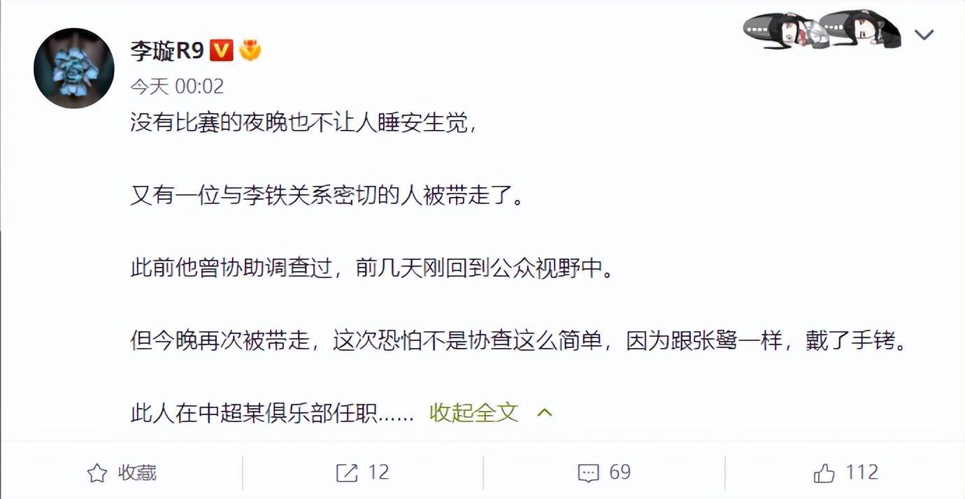 而前央視記者冉雄飛在上週就預言過,包括鄭斌在內“前健力寶系”球員很快會接受調查。不過根據李璇的消息,鄭斌這次恐怕不是協助調查,因爲他跟前國門張鷺一樣是被拷走的。