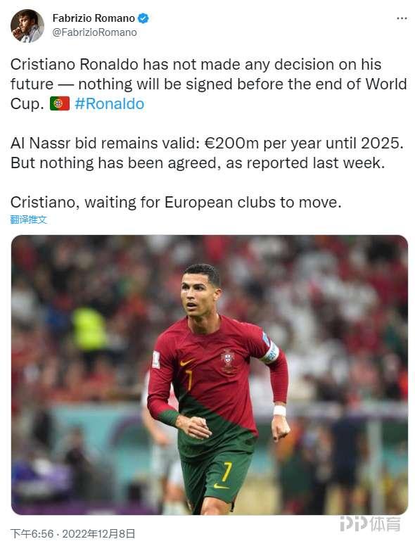 北京時間12月8日,著名轉會記者羅馬諾法發文談到C羅,他表示這名葡萄牙巨星仍未對自己的未來做出任何決定。羅馬諾寫道:“C羅仍未對自己的未來做出任何決定,他不會在世界盃結束之前與任何俱樂部簽訂任何協議。”“利雅得勝利的報價仍然有效,合同期至2025年,年薪2億歐元,但如上週報道的那樣,雙方還未達成任何協議。”“C羅現在正在等待歐洲俱樂部行動。”