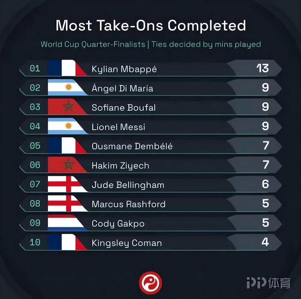 12月9日晚間,卡塔爾世界盃1/4決賽就將開戰。近日,國外數據媒體Squawka統計了本屆世界盃目前,球員們完成過人次數的排行,其中法國球星姆巴佩以13次過人居首。【過人次數排行】1、姆巴佩,13次2、迪馬利亞、布法爾、梅西,9次5、奧斯曼-登貝萊、齊耶赫,7次7、貝林厄姆,6次8、拉什福德、加克波,5次10、金斯利-科曼,4次