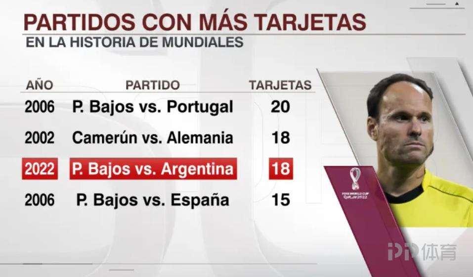 世界盃1/4決賽,荷蘭阿根廷兩隊常規時間和加時賽戰成2-2平局,阿根廷隊經過點球大戰4-3淘汰荷蘭,晉級世界盃半決賽。本場比賽的主裁判馬特烏-拉奧斯一共出示了17張黃牌和1張紅牌,總計18張牌,這與2002年喀麥隆0-2德國比賽中的18張牌持平(16黃2紅),僅次於2006年世界盃葡萄牙1-0荷蘭比賽中的20張牌(16黃4紅)。