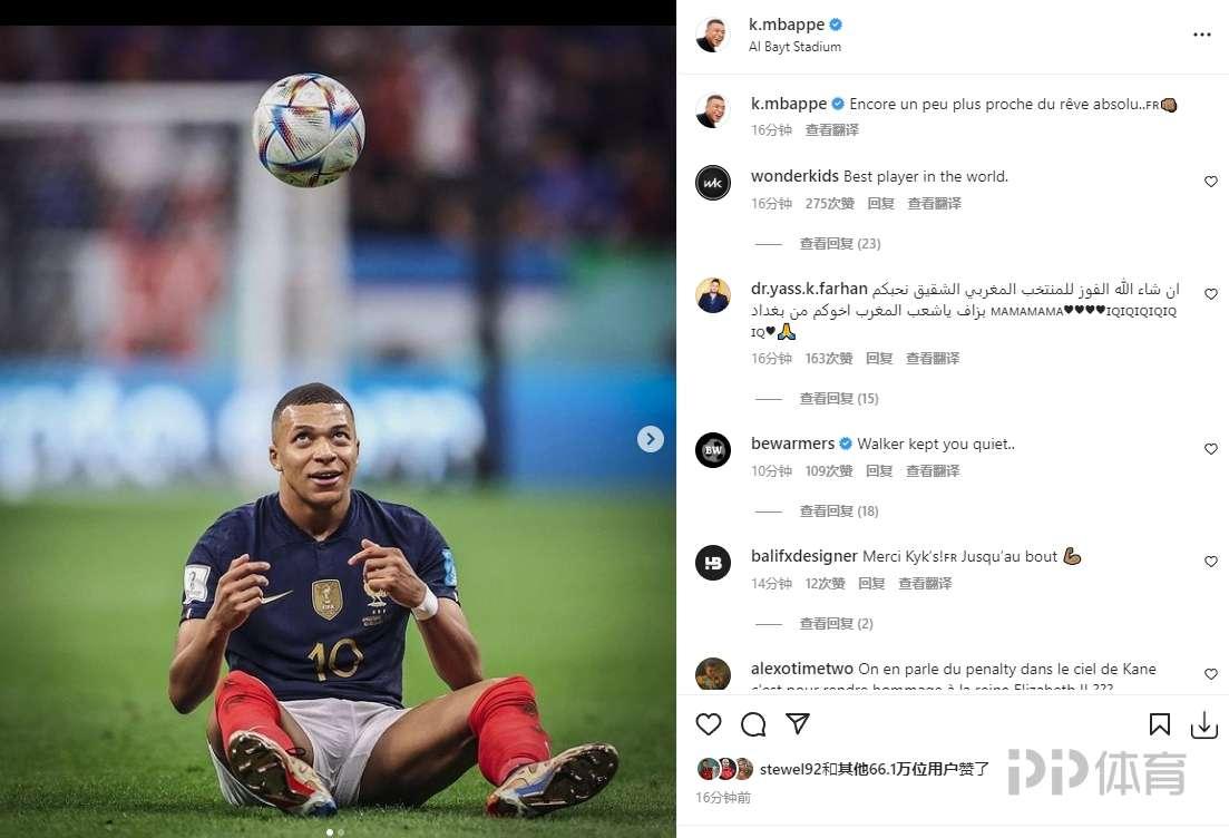 姆巴佩寫道:“距離絕對的夢想又近了一步……法國加油!”