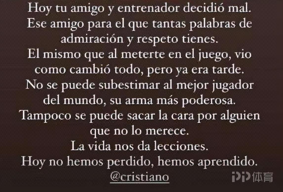 世界盃1/4決賽,摩洛哥淘汰葡萄牙進四強。賽後C羅女友喬治娜發文。喬治娜:今天你的朋友和教練都做出了錯誤的決定,你對那位朋友充滿了欽佩和尊重,當他讓你上場時,他看到一切都變了,但爲時已晚。你不可以低估世界上最好的球員,最強大的武器。更不用說爲那些不值得的人,挺身而出了。生活給了我們上了一課,今天我們沒輸,而是學到了,我們欽佩你。