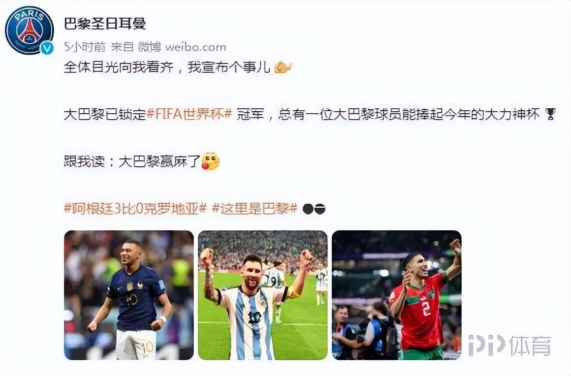 在阿根廷率先晉級本屆世界盃決賽後,最終的冠軍也將在阿根廷、法國以及摩洛哥之間產生,而三支球隊都擁有效力巴黎聖日耳曼的球員,因此大巴黎官博調侃表示自己“贏麻了”。除了姆巴佩等衆多法國國腳在大巴黎效力外,阿根廷的梅西以及摩洛哥的阿什拉夫也在大巴黎效力,對此大巴黎官博調侃寫道:“全體目光向我看齊,我宣佈個事兒!大巴黎已鎖定FIFA世界盃冠軍,總有一位大巴黎球員能捧起今年的大力神杯跟我讀:大巴黎贏麻了!”