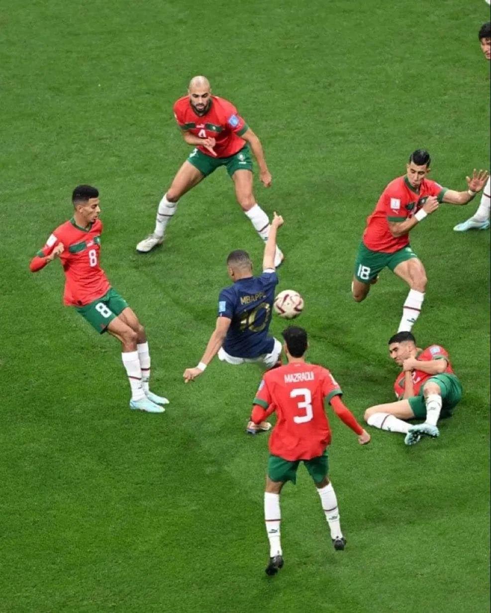 領先的法國人開始戰略性回撤,這讓摩洛哥有了表現自己的機會,他們向世界了此前深藏不露的一面,也展示了他們的決心。齊耶赫和布法爾開始輪番衝擊法國人的邊路,上半場結束前,摩洛哥人擊中了法國隊球門的立柱,他們距離進球,還差一點。