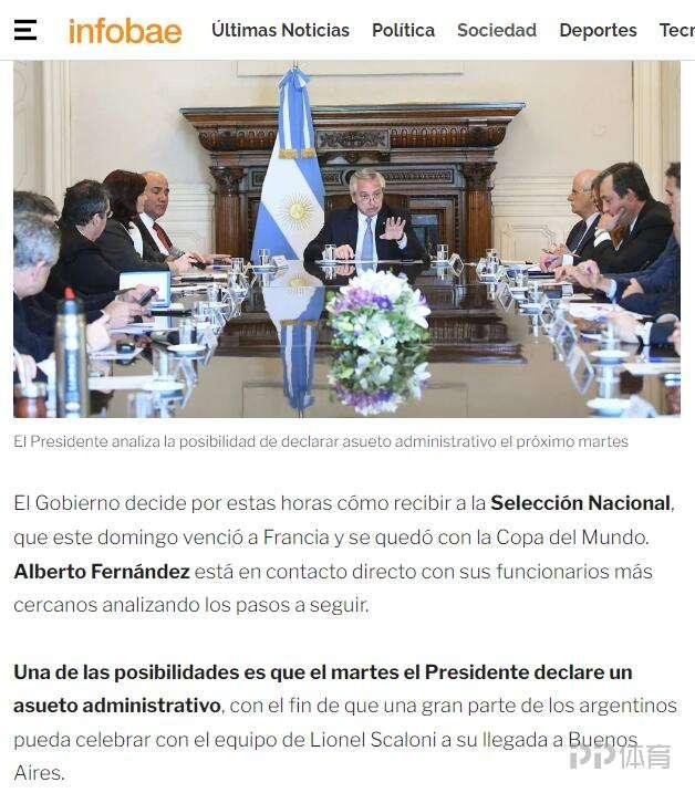 據南美門戶網站infobae消息,阿根廷世界盃奪冠後,總統阿爾貝託-費爾南德斯正在商討如何慶祝這一盛事。阿根廷政府可能宣佈在當地時間週二放假,讓阿根廷人民一起和回國的球隊慶祝。媒體分析了週一放假的可能性,但由於阿根廷預計當地時間週一晚才能回到國內,所以可能週二纔會宣佈行政假期。此外,阿根廷的體育與旅遊部門正在努力安排阿根廷與總統會面、遊行慶祝等相關行程。