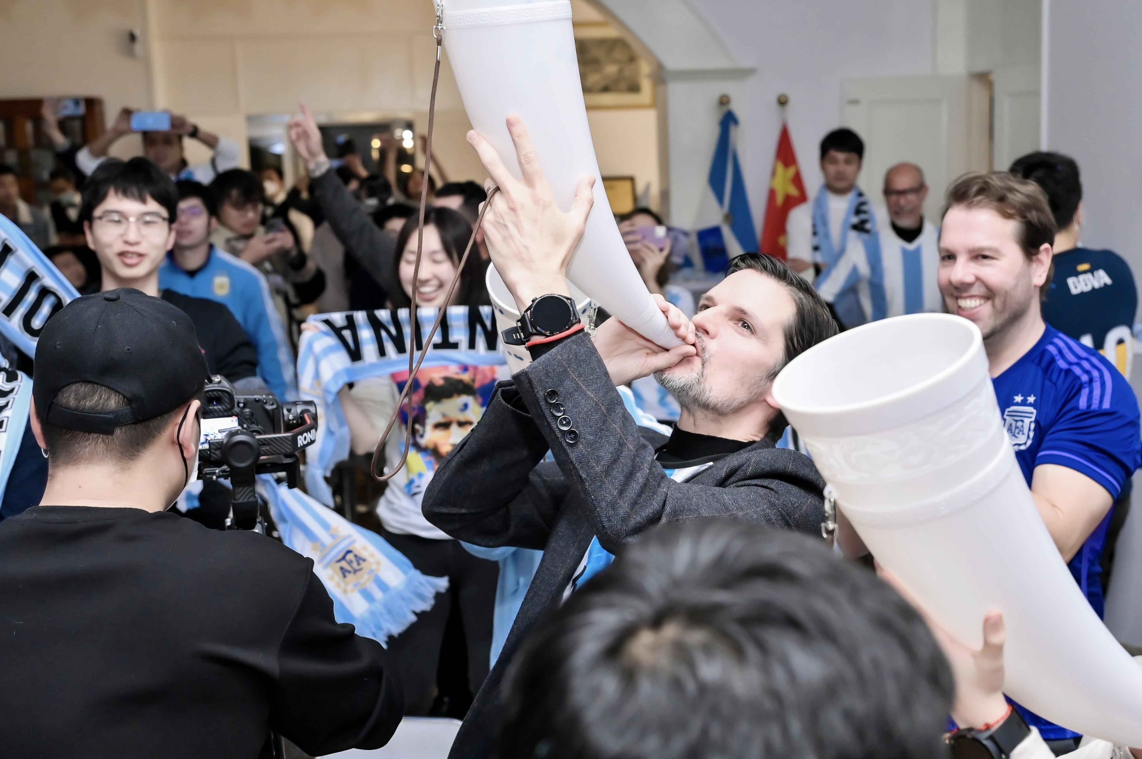 梅西征戰多屆世界盃,其實每一屆都離不開“梅吹”們的不懈支持。但這一屆稍微有點特殊:這一屆的“梅吹”不止可以“指人”,還可以“指物”——也就是球場外引起了國內外媒體和球迷關注的一款中國風“嗚嗚祖拉”。