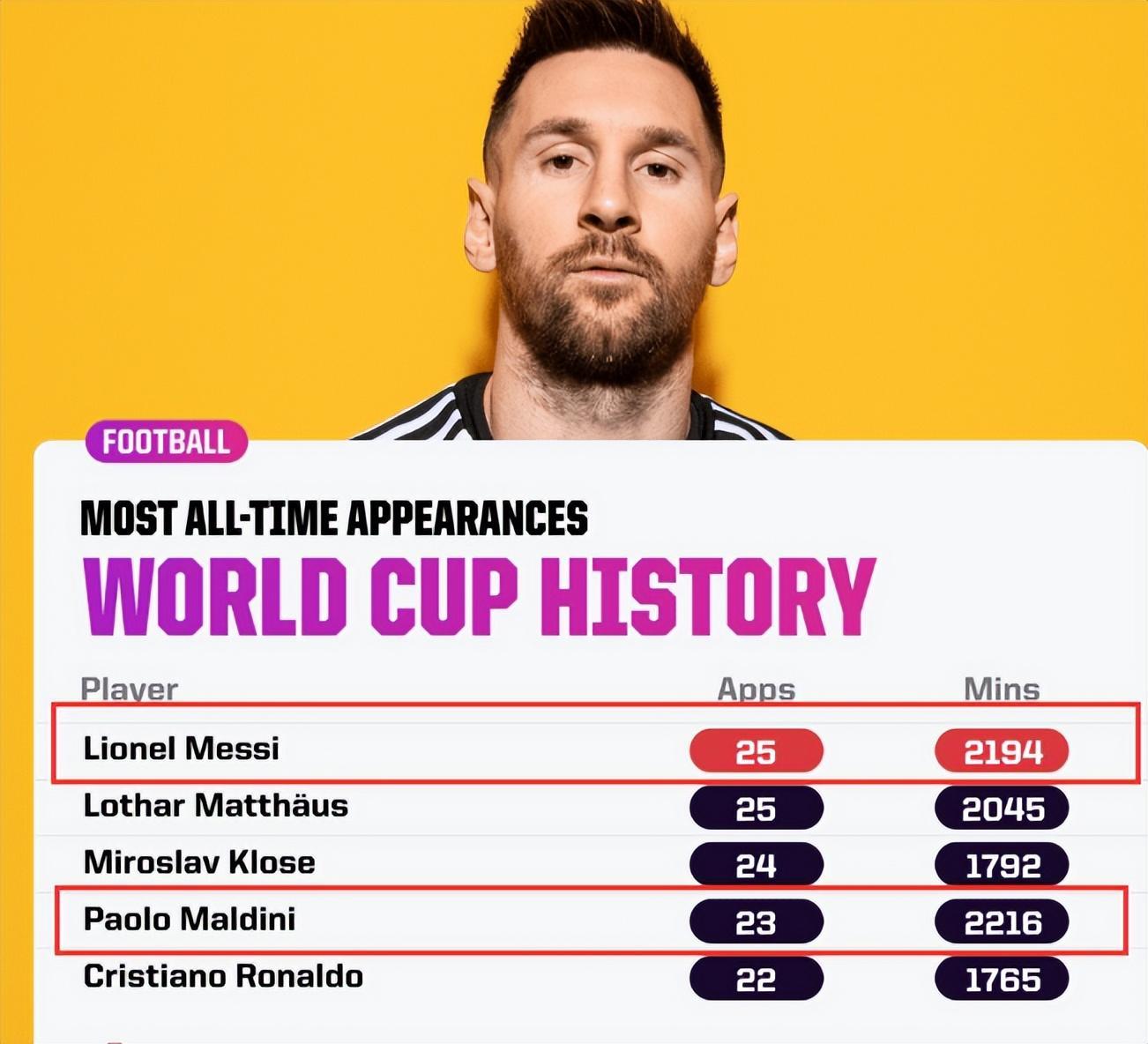 世界盃決賽出場,讓梅西以26次世界盃出場,超越馬特烏斯成爲世界盃出場次數最多的球員,同時也2214分鐘的出場時間,超過馬爾蒂尼成爲世界盃出場時間最多的球員。