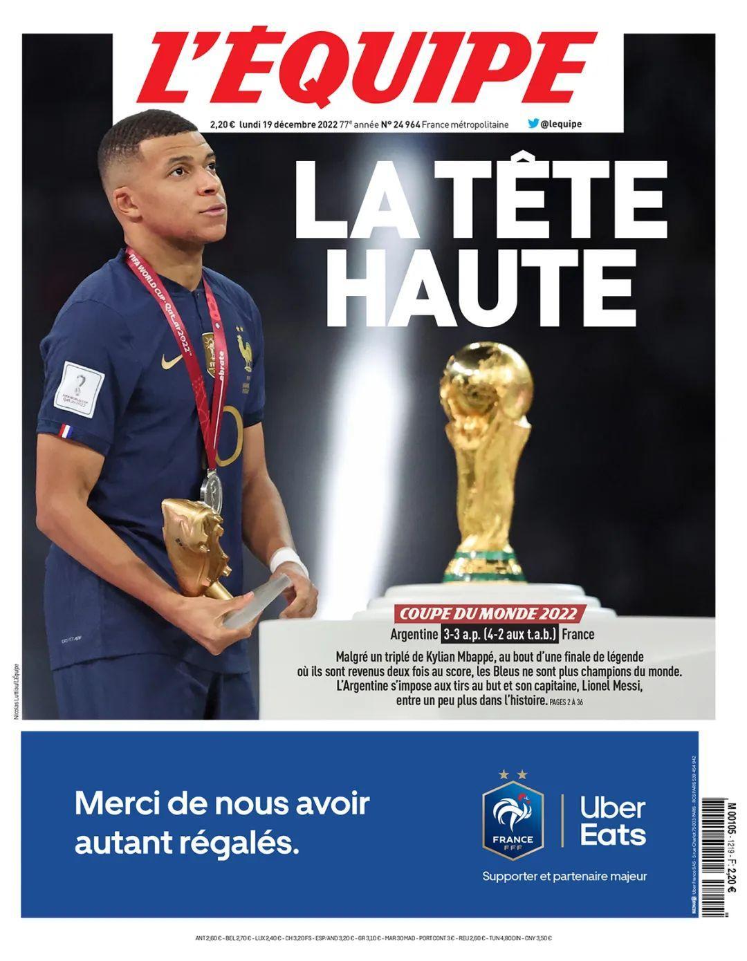 《隊報》的頭版選用了姆巴佩仰望盧賽爾球場的照片,而不是低頭掩飾巨大失望。媒體這樣定義這場足以載入世界盃經典比賽史冊的決賽:“法國隊是英勇的,經歷了殘酷、壯觀而令人窒息的決賽後,他們距離衛冕只差幾釐米。”