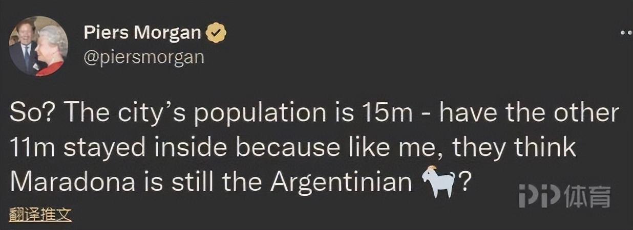 世界盃冠軍阿根廷歸國受到許多阿根廷民衆的熱烈歡迎。據報道,阿根廷首都布宜諾斯艾利斯有400萬人出門慶祝。皮爾斯-摩根對此不屑一顧:所以?這座城市有1500萬人口——是不是還有1100萬人在裏面,就像我一樣認爲,馬拉多納纔是阿根廷人的GOAT?