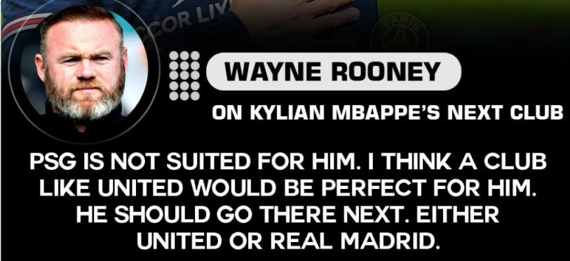 曼聯名宿魯尼說:“大巴黎已經不適合姆巴佩,他認爲像曼聯這樣的俱樂部更適合他,他應該去曼聯。或者說,他可以去曼聯或者皇馬。”
