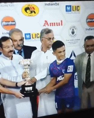 再來關注一下印度足球。上週末,2022年杜蘭德杯落下帷幕,班加羅爾隊2比1擊敗孟買城,奪得冠軍。班加羅爾隊長,印度傳奇球星切特里上臺領取冠軍獎盃,西孟加拉邦邦長加尼森作爲頒獎嘉賓負責頒獎,但在之後的合影環節中,出現了這樣一幕: