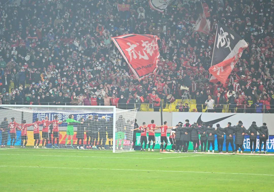 這是極度瘋狂的一個晚上,對於成都的球員來講,他們是第一次在中超平臺感受球迷現場的助威,也是本賽季第一次在如此聲勢浩大的現場踢球。用他們的話來講,興奮得腳都在發抖。他們在踢球過程中,會時不時抬起雙手和球迷互動,希望看臺上的造勢能夠給自己帶來激勵的同時也給對手帶去壓力。這樣的場景,彷彿回到了三年之前,依然紅火的中超賽場。