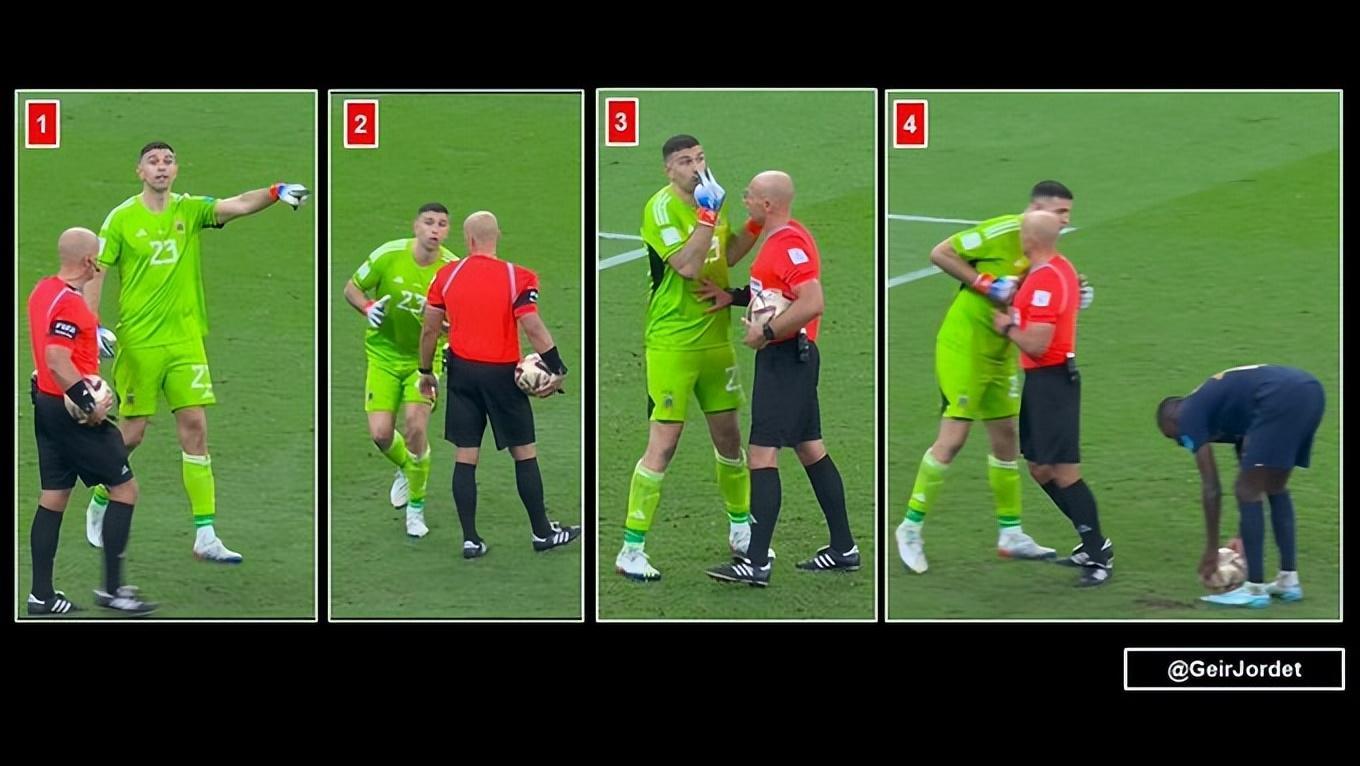 隨後爲避免洛裏效仿自己的心理戰術,他立刻撿起皮球交給隨後主罰的隊友帕雷德斯,繼續扮演禁區內的主宰者角色。法國隊第4位罰球手穆阿尼出場時,馬丁內斯繼續採取心理攻勢,故意與邊線外的法國隊教練組發生爭執,拖延時間之餘還對着穆阿尼說了很多次:“我盯死你了。”雖然喫到了黃牌,但目的完全達到了。再加上楚阿梅尼中計罰失後誇張的聳肩舞,自始至終馬丁內斯都在牽着法國隊員的鼻子走,牢牢掌握着心理優勢。