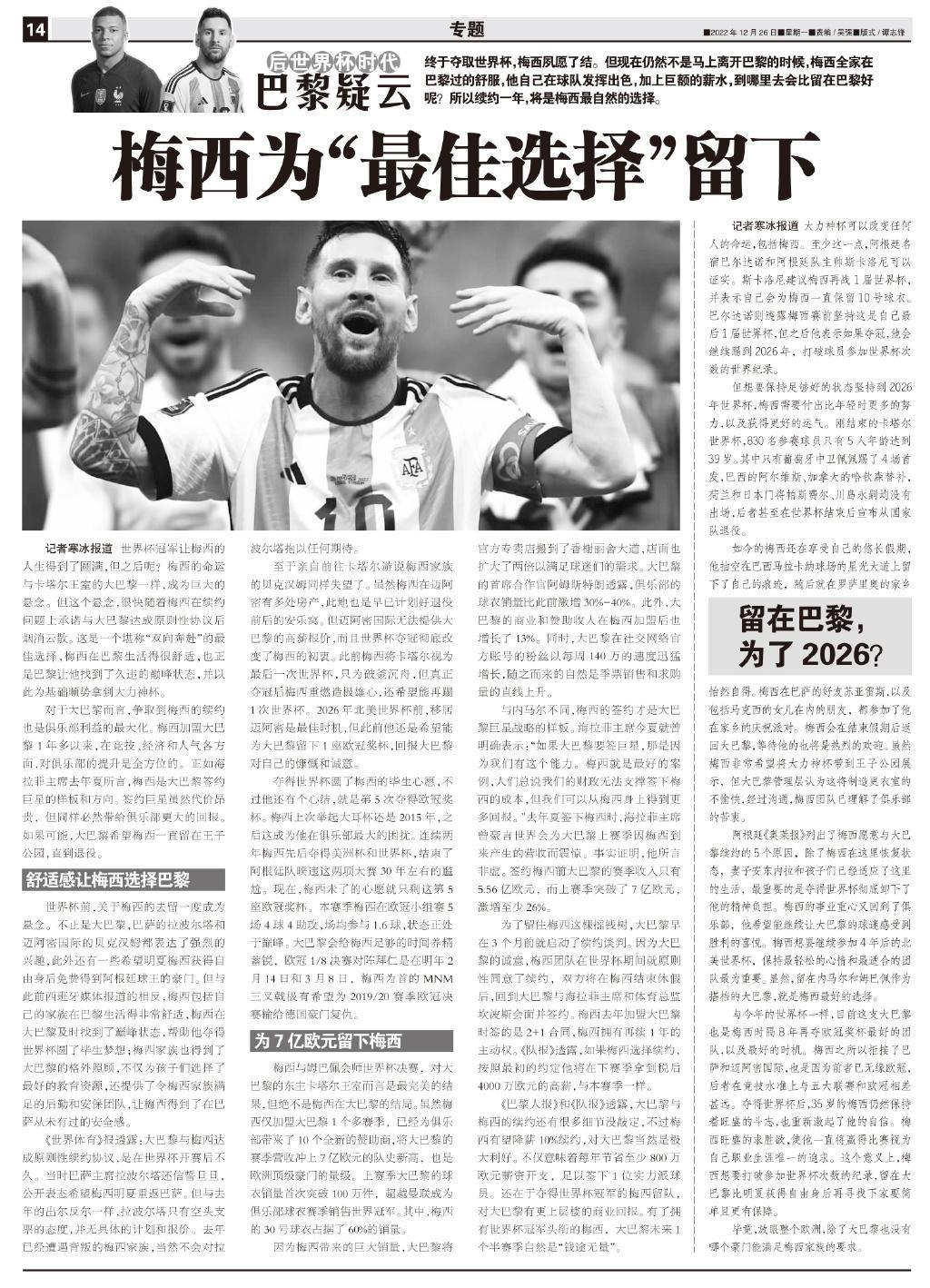 世界盃前,關於梅西的去留一度成爲懸念。不止是大巴黎,巴薩的拉波爾塔和邁阿密國際的貝克漢姆都表達了強烈的興趣,此外還有一些希望明夏梅西獲得自由身後免費得到阿根廷球王的豪門。但與此前西班牙媒體報道的相反,梅西包括自己的家族在巴黎生活得非常舒適,梅西在大巴黎及時找到了巔峯狀態,幫助他奪得世界盃圓了畢生夢想;梅西家族也得到了大巴黎的格外照顧,不僅爲孩子們選擇了最好的教育資源,還提供了令梅西家族滿足的後勤和安保團隊,讓梅西得到了在巴薩從未有過的安全感。