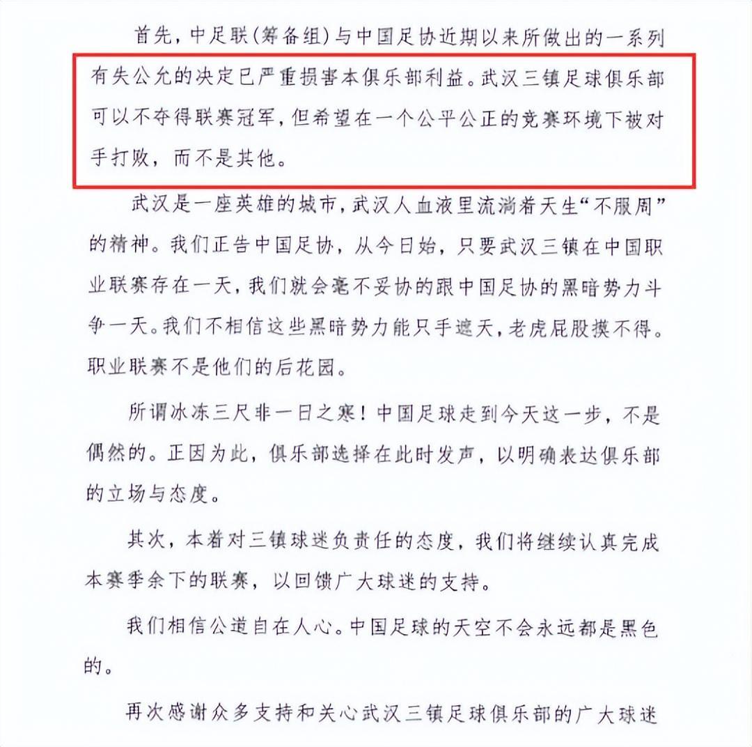 武漢三鎮這一份官方聲明,每一句話都帶着刺,直言俱樂部可以不拿冠軍,但前提是在公平公正的環境下被對手擊敗。
