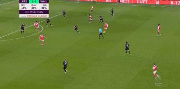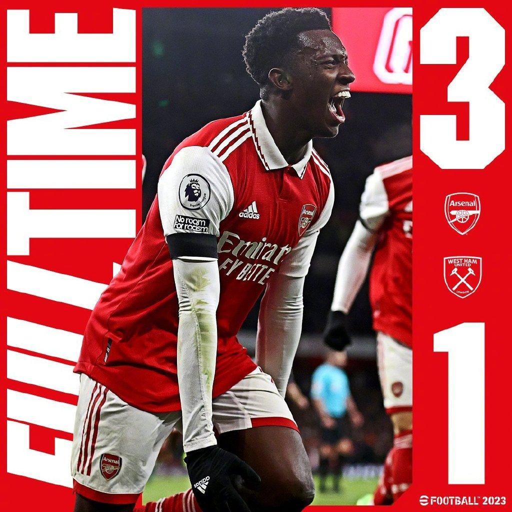 上半場0-1落後的情況下,阿森納在下半場憑藉着薩卡、馬丁內利和恩凱蒂亞16分鐘連進3球,最終以3-1的比分逆轉西漢姆聯,收穫主場7連勝。