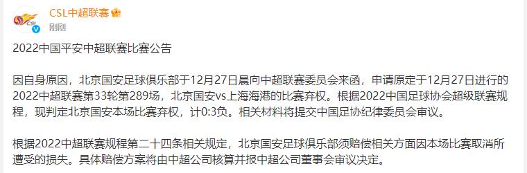 北京時間12月27日上午10點,中超官方宣佈北京國安本輪棄賽,上海海港被判3-0勝,北京國安需承擔因本場比賽取消所遭受的損失。