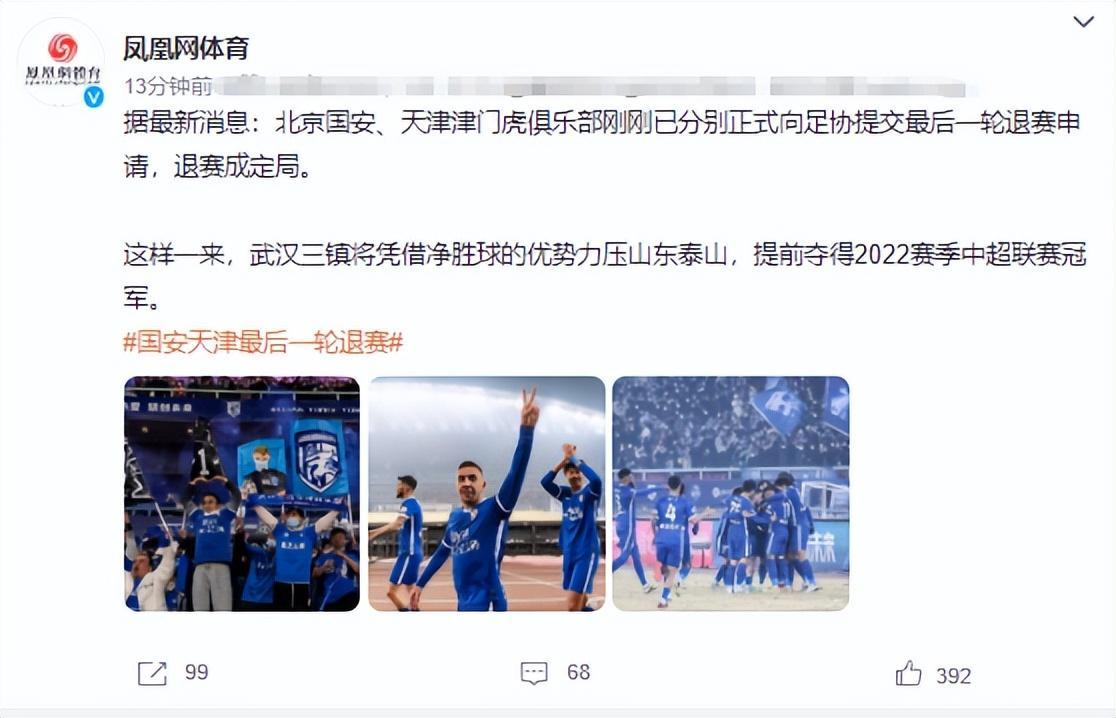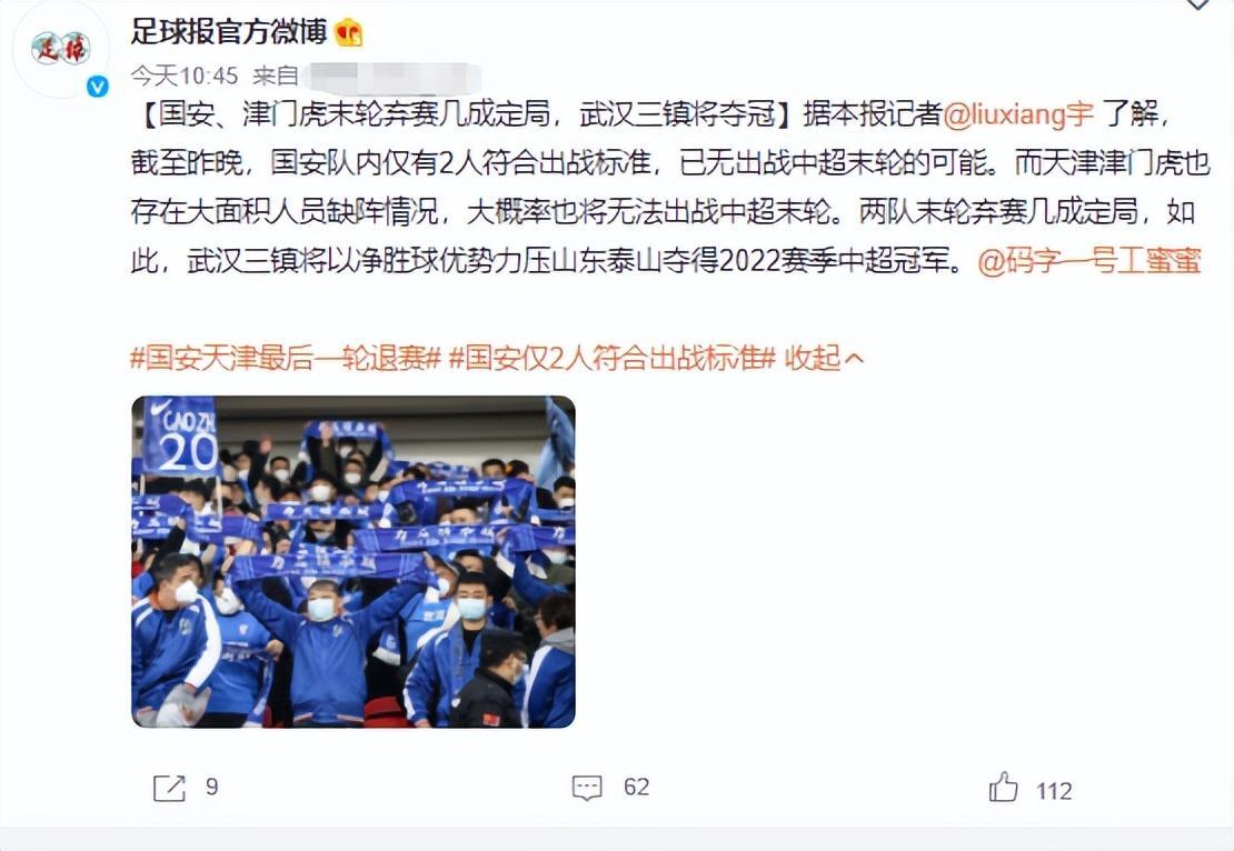 國內國家媒體確認,北京國安和天津津門虎已經向足協提交最後一輪棄權的申請,武漢三鎮和山東泰山將被判3-0勝,武漢三鎮將會以淨勝球優勢力壓山東泰山奪冠。