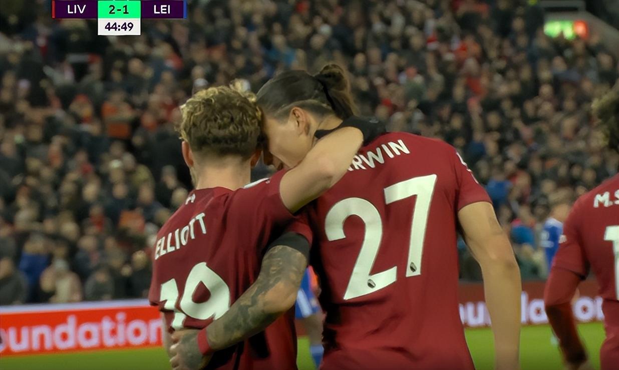 第45分鐘,努涅斯單刀球打門擊中右立柱,回防剎不住車的法斯近距離把球撞進了自家大門,利物浦反超比分2-1。