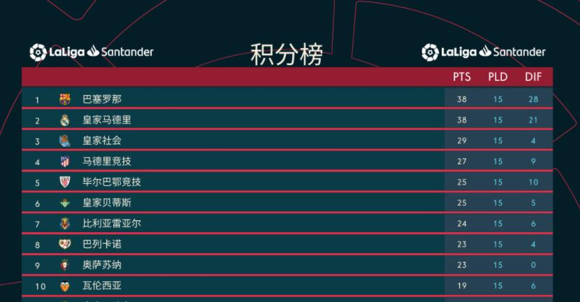 由於皇馬本輪客場2-0擊敗巴拉多利德,所以巴薩在積分榜上已經被皇馬追平,但他們仍然憑藉着7個淨勝球優勢,力壓皇馬坐穩榜首位置。
