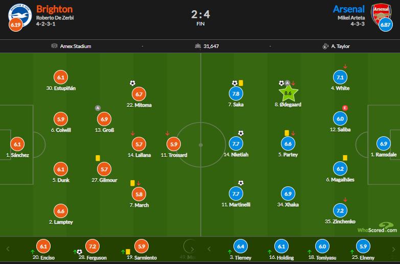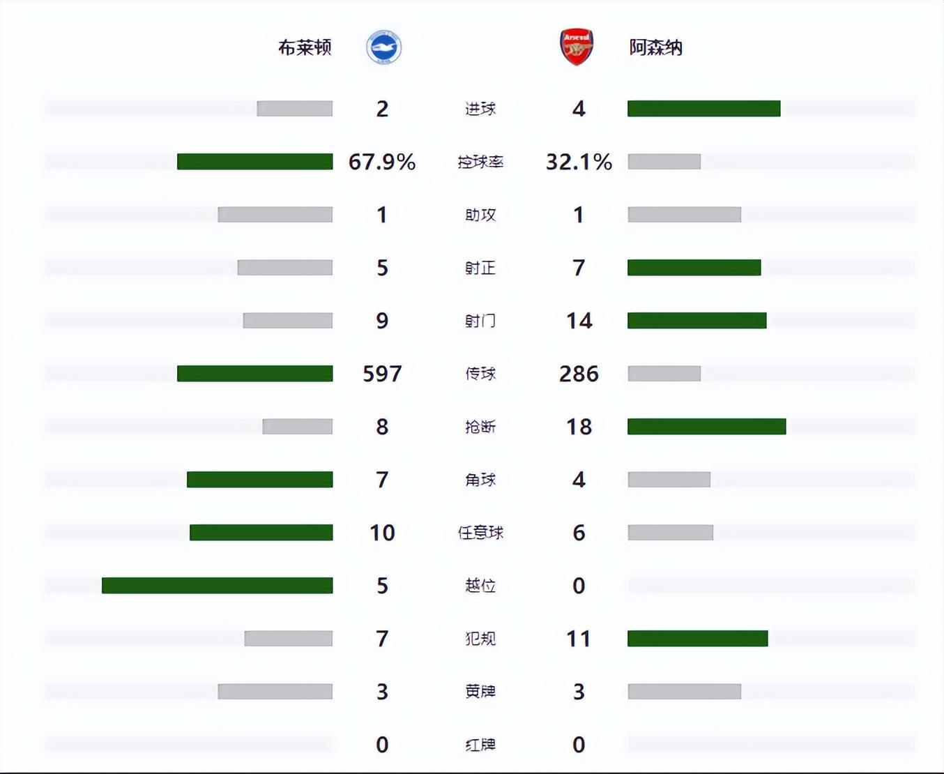此後,雙方都無法再次改寫比分,最終阿森納4-2擊敗布萊頓。