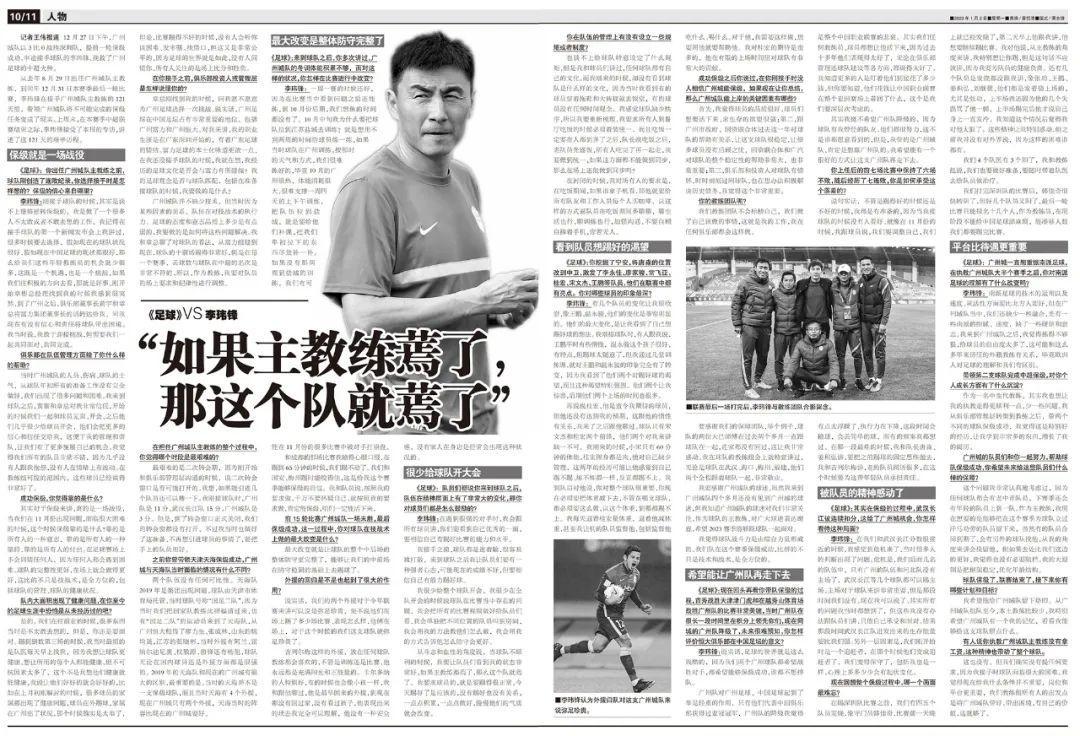 李瑋鋒:在我們和武漢長江分數很接近的時候,我感覺到危機來了,當時很多人的判斷出現了問題。危機是,我們後面幾名的隊伍中,只有廣州的隊伍和河北隊沒有主場了,武漢長江等幾個球隊都可以踢主場。主場對於球隊來講非常重要,但是那段時間我們沒有。現在我可以說了,其實所有的問題我當時都想到了,但這些我沒有辦法跟隊員們講,只能自己承受和麪對。結果那段時間武漢長江隊迸發出來的生存能量要比我們強。另外一層因素是,我們剛開始時是一個追趕者,在那個時候他們變成追趕者了,我們變得保守了,包括我也是一樣,心理上多多少少會有起伏變化。