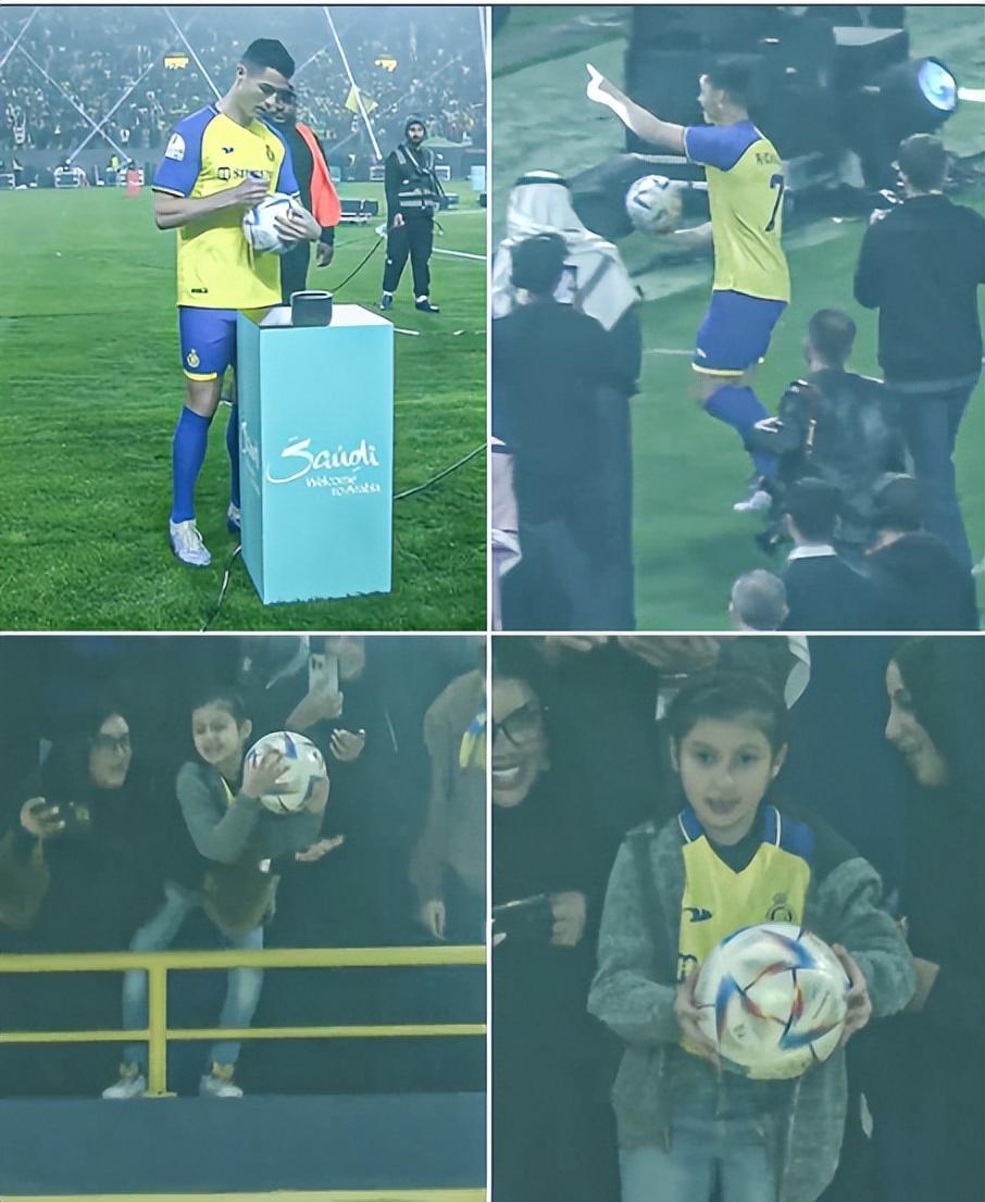 在新東家利雅得勝利的亮相儀式上,37歲的C羅再現暖心一幕,他將最後一個簽名足球,親手交給看臺上的一個可愛小女孩。