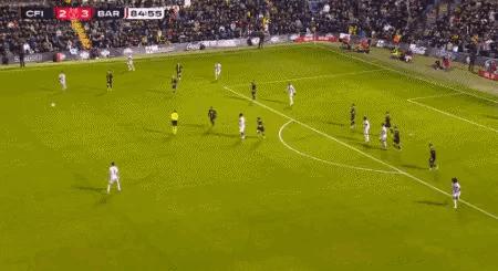第77分鐘,阿爾巴禁區左側低平球橫掃到門前,拉菲尼亞在後點輕鬆打空門得手,巴薩3-2領先。