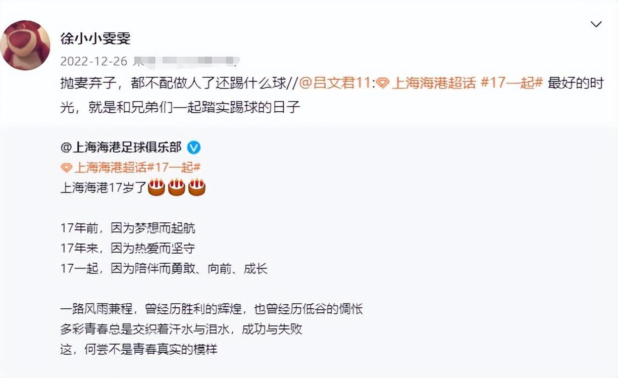 在剛結束的足協盃1/4決賽首回合比賽中,33歲國腳呂文君打進一球,幫助上海海港4-0擊敗成都蓉城,一隻腳踏進了足協盃4強。不過呂文君卻開心不起來,因爲他最近這段時間被妻子連續發文炮轟。