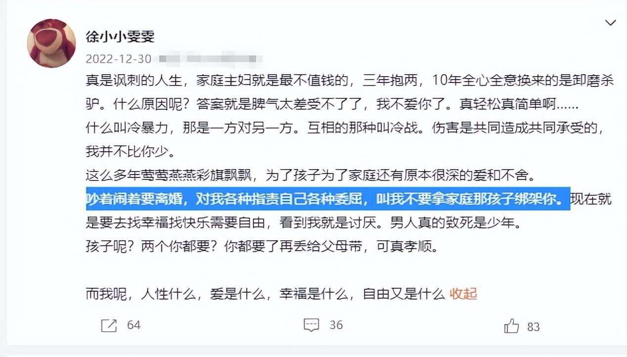去年12月26日,妻子就在社交平臺上寫道:“拋妻棄子,都不配做人了還踢什麼球。”4天后,妻子又指責呂文君卸磨殺驢,吵着鬧着要離婚。
