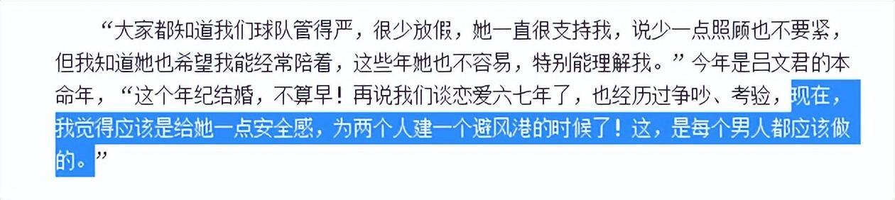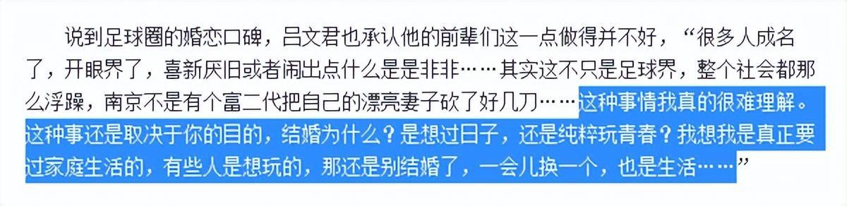 當時呂文君接受採訪時說的話,看起來是一個深情的好男人。他說,很多球員成名後就會貪新厭舊,但他結婚的目的是過日子不是玩青春,並告誡年輕人要是想玩的就別結婚。除此之外,他還說結婚只想給妻子一點安全感,爲妻子建一個避風港也是每個人應該有的責任。