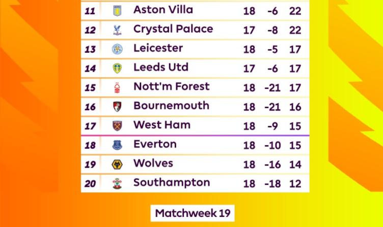 球隊總身價分別爲4.08億歐元和3.88億歐元的埃弗頓和狼隊,竟然在降級區,也側面證明了英超的競爭是多麼的激烈。當然,其實英超第13到英超第19,這7支隊之間最大分差其實也只有3分。埃弗頓和狼隊隨時可能上岸,而靠近降級區的那5支球隊也隨時可能被拉下水。當然,哪怕是墊底的南安普頓也有12分在手,跟倒數第4的西漢姆聯也只有3分差距。他們在冬窗已經敲定克羅地亞國腳奧利西奇,以補強球隊攻擊線。