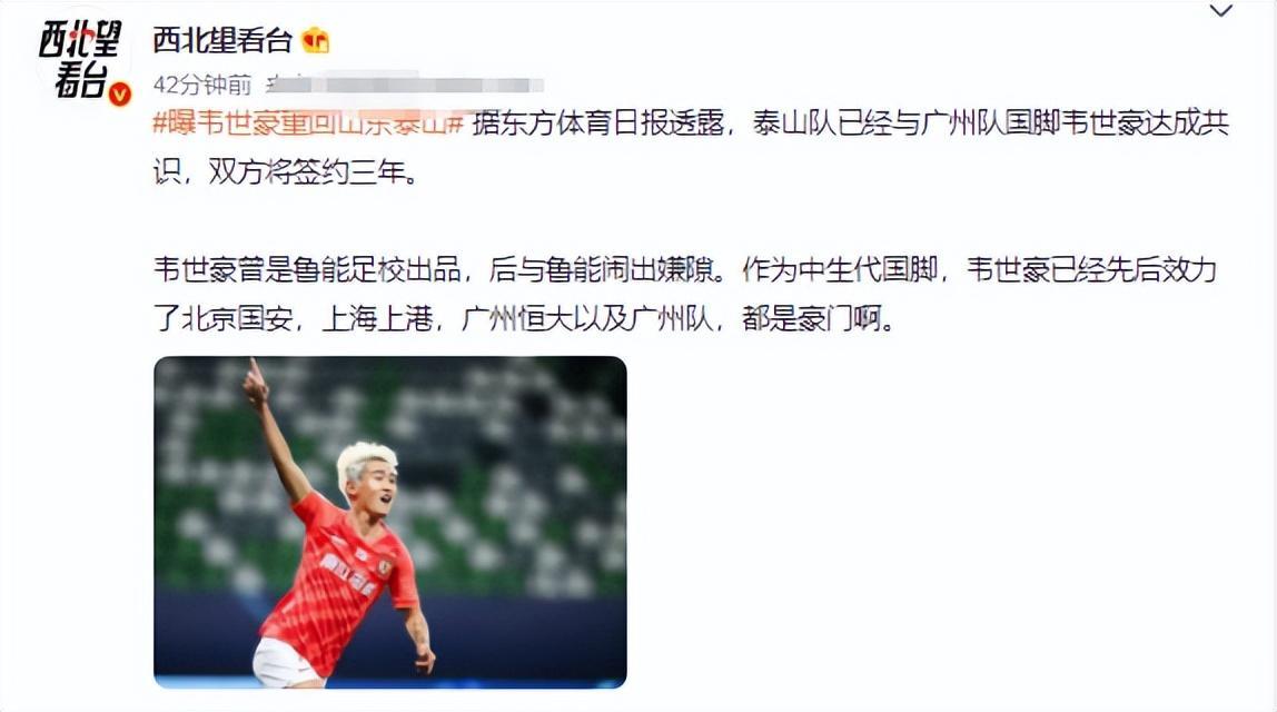《東方體育報》稱,山東泰山已經跟27歲國腳韋世豪達成協議,雙方將簽約三年。