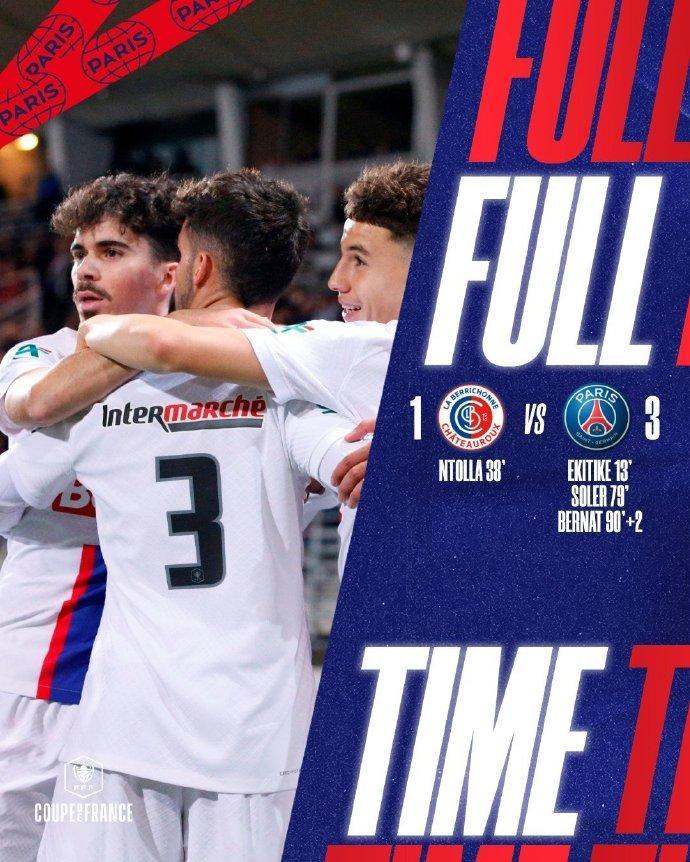 北京時間1月7日04:00,法國杯第9輪,梅西、內馬爾和姆巴佩同時缺陣,埃基蒂克、索萊爾和貝爾納特各進一球,巴黎聖日耳曼客場3-1擊敗法丙球隊沙託魯,晉級32強。