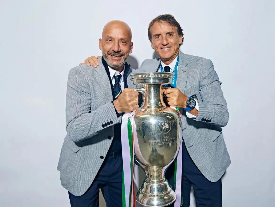 維亞利足球乃至人生最後的輝煌,自然是2019年開始擔任意大利國家隊領隊,與摯友曼奇尼通力合作。期間,他戰勝了胰腺癌,又在溫布利球場捧起了德勞內杯。這是意大利足球闊別15年,纔再次拿到重大賽事冠軍,而且還是在他最熟悉的溫布利球場擊敗東道主英格蘭奪冠,堪稱巔峯。