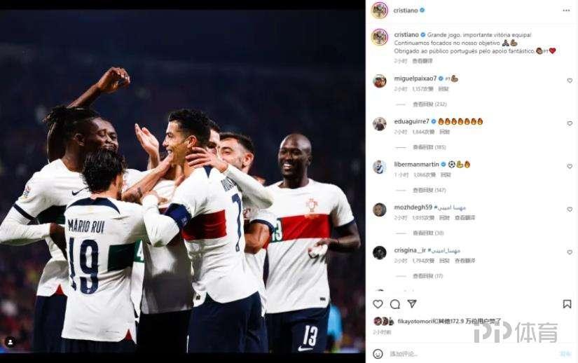 在今天凌晨的歐國聯A級別比賽中,葡萄牙客場4-0大勝捷克,反超西班牙登上小組榜首。賽後,隊長C羅更新了個人社媒。C羅寫道:“精彩的比賽,重要的團隊勝利!我們一直專注於我們的目標,感謝葡萄牙球迷夢幻般的支持。”本場比賽C羅未能取得進球。上半場他在爭頂時被對方門將擊中面部血染賽場,隨後在防守角球時手球送點。終場前,C羅頭球助攻若塔破門。