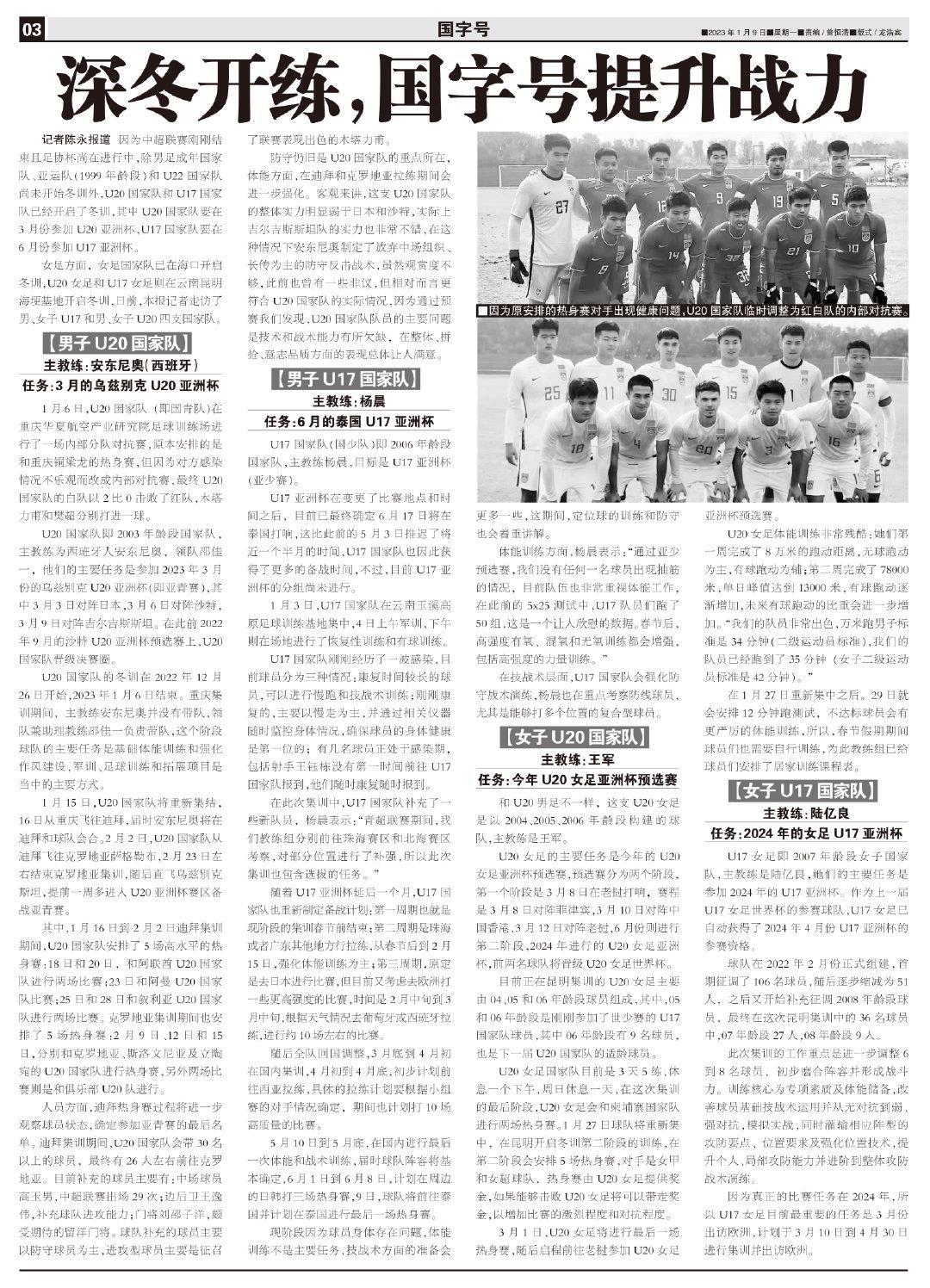 記者陳永報道 因爲中超聯賽剛剛結束且足協盃尚在進行中,除男足成年國家隊、亞運隊(1999年齡段)和U22國家隊尚未開始冬訓外,U20國家隊和U17國家隊已經開啓了冬訓,其中U20國家隊要在3月份參加U20亞洲盃,U17國家隊要在6月份參加U17亞洲盃。
