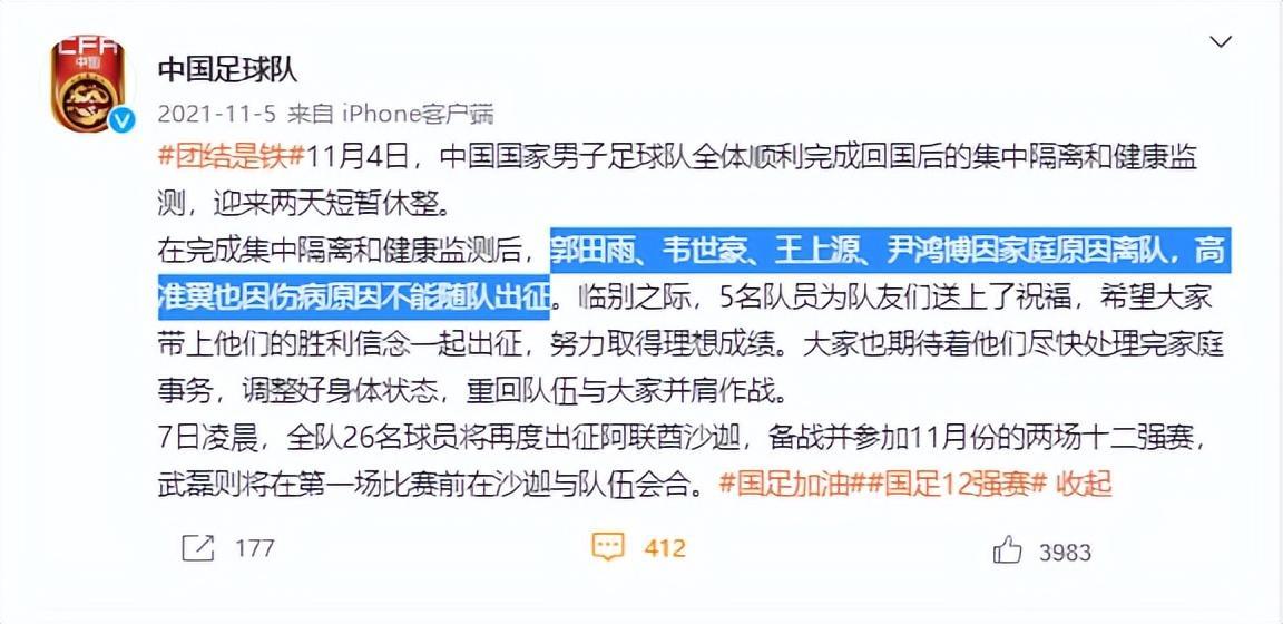 翻查中國足球隊官方微博,他們確實在2021年11月份官宣5人離隊,高準翼是因傷病原因離開的,所以他肯定不是被李鐵摔手機那位。另外有4人是因爲“家庭原因”離隊的,王上源和尹鴻博肯定不是年輕球員了。雖然韋世豪有點痞,當時他也26歲,算是年輕球員嗎?
