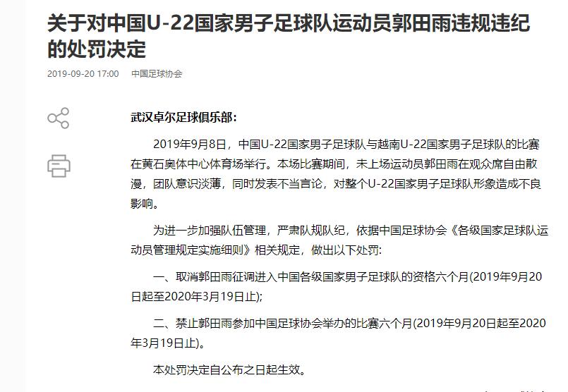 在2019年,郭田雨就因爲在看臺上玩手機被禁賽半年。原本郭田雨被給予厚望,在2021賽季進球上雙,幫助山東泰山奪得中超冠軍,隨後還被外租至葡超球隊維澤拉鍛鍊。但留洋半年回來後,郭田雨在2022賽季出場16次只打進3球。