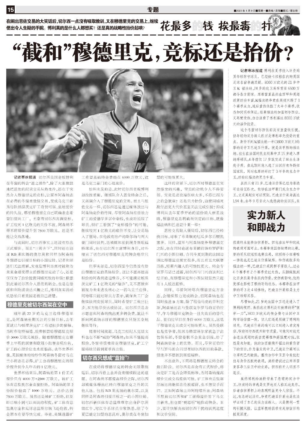 切爾西美國老闆博利在冬窗的轉會“迷之操作”,除了大張旗鼓地把恩佐的紀錄交易從熱變冷,還在於突然介入穆德里克的競標,讓原本阿森納志在必得的冬窗重量級交易,變成烏克蘭新秀母隊頓涅茨克礦工奇貨可居、坐地要價的持久戰。哪怕穆德里克自己明確表態希望加盟兵工廠,無奈有切爾西高調競標,礦工咬死1億歐元的天價不放。阿森納不得不將報價提升到7500萬歐元,還是不能讓交易落地。