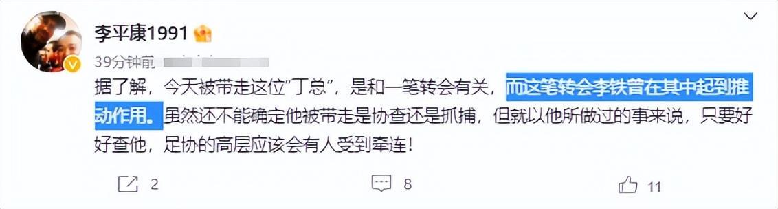 李平康稱,丁勇這次被帶走可能跟一筆轉會有關,其中李鐵在轉會中扮演了中間人的角色。其實李平康和丁勇之間早就有點恩怨。在天津天海解散一個賽季,李平康曾經發布過丁勇僱記者抹黑天海,但隨後刪了這則不實消息但並沒道歉。