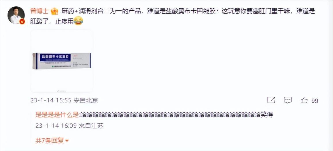 一位坐擁200萬粉絲的“曾博士”留言稱:“麻藥加潤滑劑合二爲一的產品,難道是鹽酸奧布卡因凝膠?這玩意你要塞肛門裏幹嘛,難道是肛裂了,止疼用(笑臉)。”