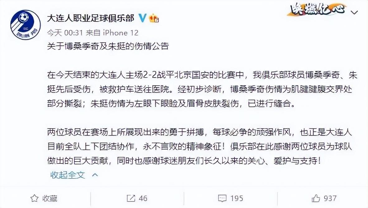 博桑季奇短期內無法痊癒甚至可能賽季報銷,朱挺雖然是硬傷但很可能影響到29日與申花的比賽。兩名主將受傷,大連人收穫這場平局所付出的代價着實有些大。