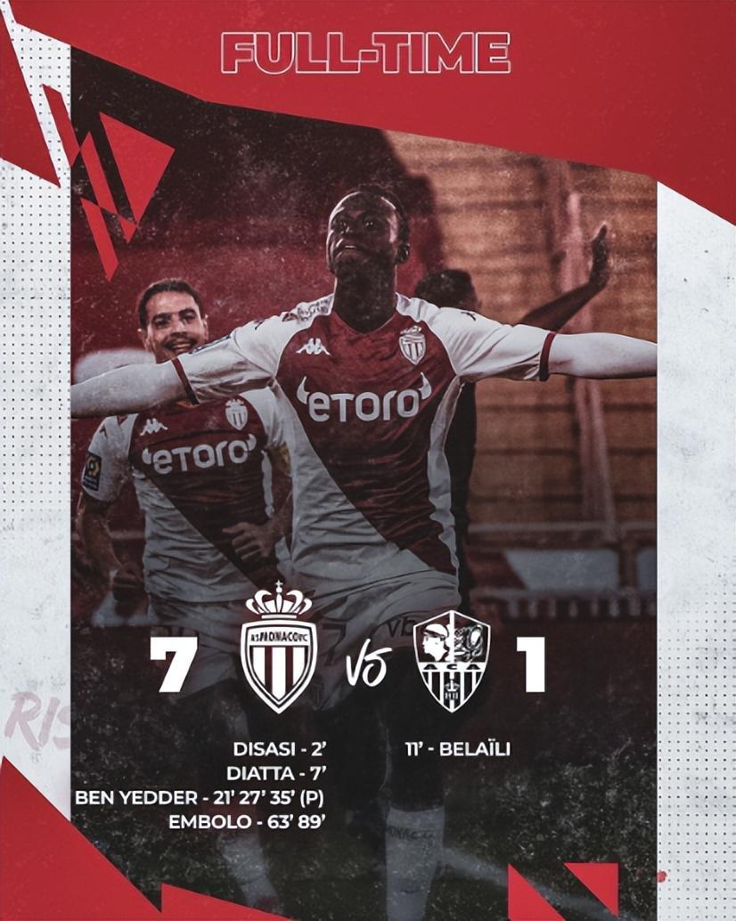 本耶德爾15分鐘戴帽,恩博洛雙響,迪薩西和迪亞塔各進一球,最終摩納哥主場7-1大勝阿雅克肖。這是摩洛哥近30年首次在法甲主場單場打進7球,上一次還是在1993年10月份主場7-0大勝馬蒂格。